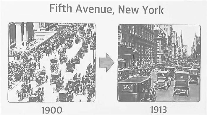 這是美國紐約的第五大道,左邊那張是1900年的,你看到一輛汽車,和九十九匹馬車。而右邊的,同樣的地方,13年后,你看到的是九十九輛車,和一匹馬車。