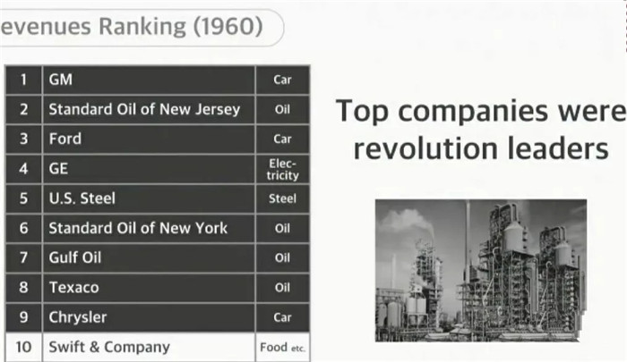 換句話說,1960年全世界最大的公司基本上是兩類:汽車和能源。在那個年代,投資這兩類公司,你就投資了未來。