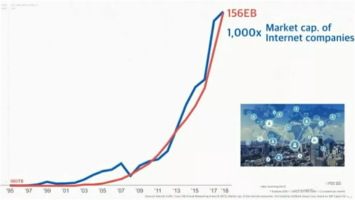 這是全球網(wǎng)絡的流量,橫坐標是年份。紅色的線代表流量。從最早的1995年到2018年,網(wǎng)絡的流量,增加了100萬倍。我們再來看另一條藍色的線。藍色的線,表現(xiàn)的是23年來全球互聯(lián)網(wǎng)公司的市場價值(市值)。
