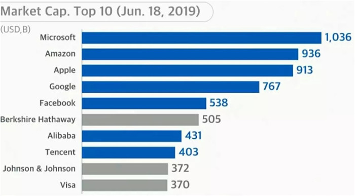 而今天,2019年市值十大的公司:微軟、亞馬遜、蘋果、谷歌、臉書、阿里巴巴、騰訊,全都是網(wǎng)絡公司。全世界市值十大的公司里,有七家是網(wǎng)絡公司。