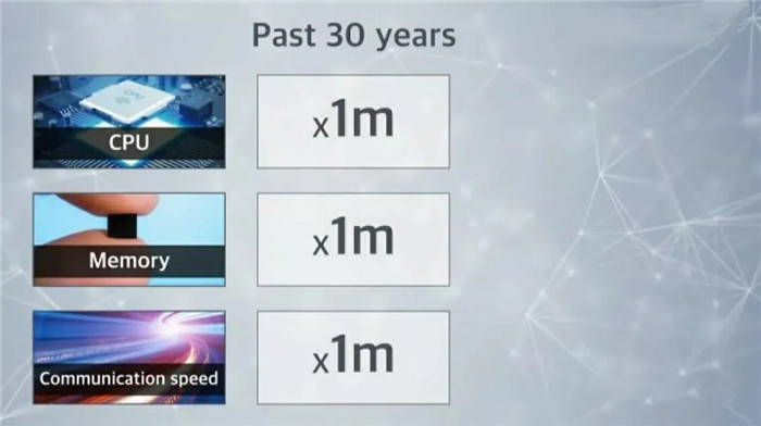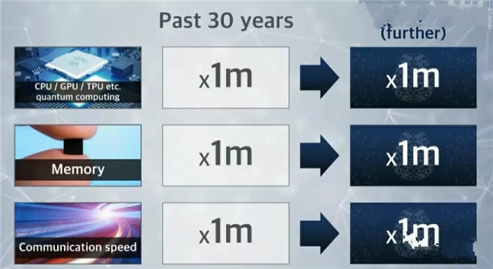 各位,處理器的運算能力,記憶體的儲存能力,互聯(lián)網(wǎng)的傳輸能力,在這30年來,都成長了100萬倍。30年來,成長的幅度是這樣,那再過30年呢?