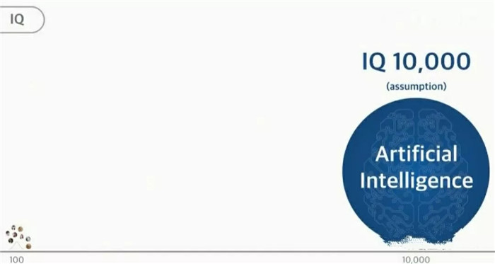 30年后,AI的智商將會是10000。你們有誰聽過哪個人的智商是10000的?人不可能,但是“人工智能”可能。一萬智商的AI,再天才的人都沒法比。
