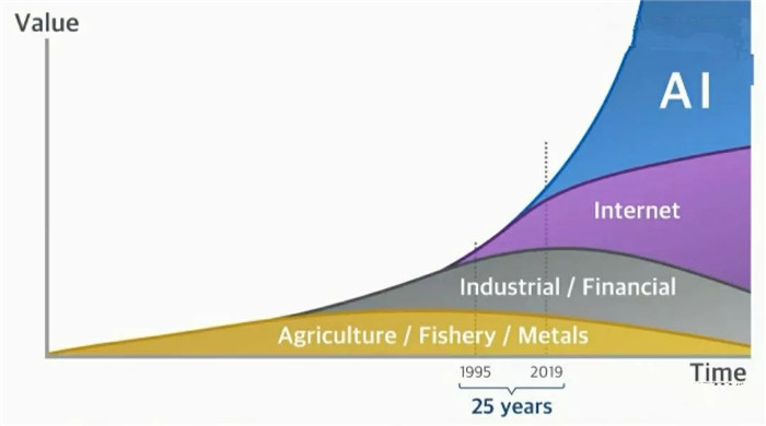 豎軸代表價值,橫軸代表時間,底部的黃色,代表農(nóng)業(yè),其價值與時間的比例一目了然;灰色代表工業(yè),紫色代表互聯(lián)網(wǎng),也就是我們正處的時代;而未來最有價值的東西,是屬于藍色的,是屬于AI的。